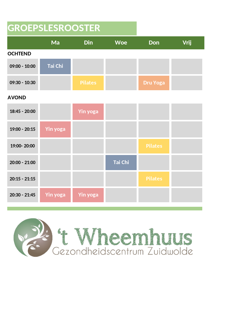 Ontspan, versterk en balanceer je lichaam en geest met onze groepslessen in yoga, pilates en Tai Chi. Bij ’t Wheemhuus bieden we een gevarieerd aanbod voor zowel beginners als gevorderden. Yoga helpt je te ontspannen en flexibiliteit te vergroten, pilates richt zich op kracht en houding, en Tai Chi brengt rust en balans door vloeiende bewegingen. Kom in beweging en ervaar de positieve effecten van deze lessen op jouw welzijn!